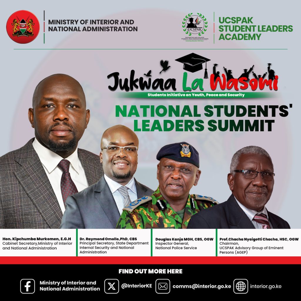 The Ministry of Interior and National Administration in collaboration with the Universities and Colleges Student Peace Association of Kenya (UCSPAK) will be hosting the first ever Jukwaa la Wasomi National Students Leaders and Security Agencies Summit on 13th and 14th November,2025 at the Kenya School of Government.